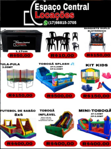 FAÇA UM ORÇAMENTO COM A GENTE (17)98815-3705 . ALUGUEL DE ESPAÇO DE LAZER . ALUGUEL DE JOGOS DE MESA . ALUGUEL DE PULA PULA TOBOGÃ INFLÁVEL, KIT KIDS, BASQUETE DUPLO ELETRONICO, FUTEBOL DE SABÃO, TOBOGÃ SPLASH, CAIXA TERMICA, KIT PEGUE E MONTE.